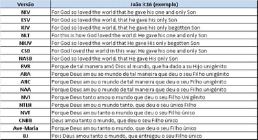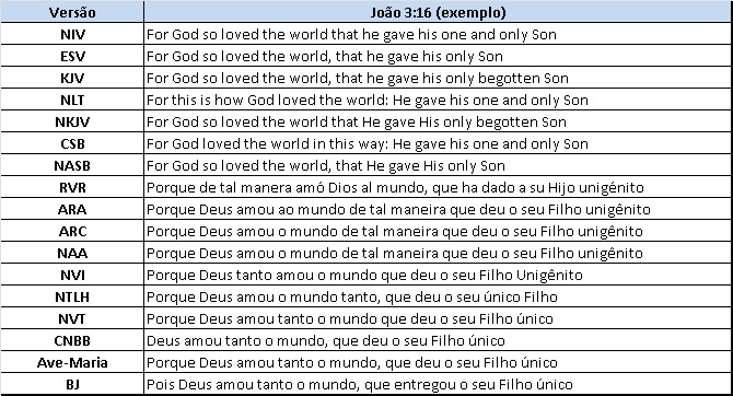 Tabela Comparativa de algumas versões, em um trecho - João 3:16.