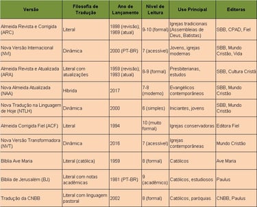 Evangélicas: Como ARC ou NVI, priorizam linguagem acessível ou literal, com notas focadas em teologia protestante (ex.: salvação pela fé).